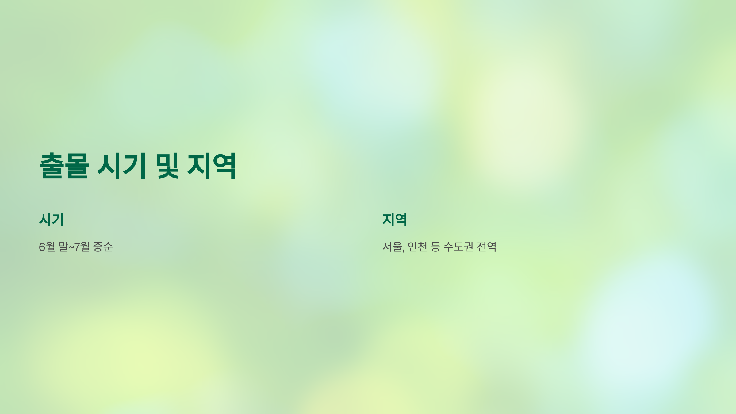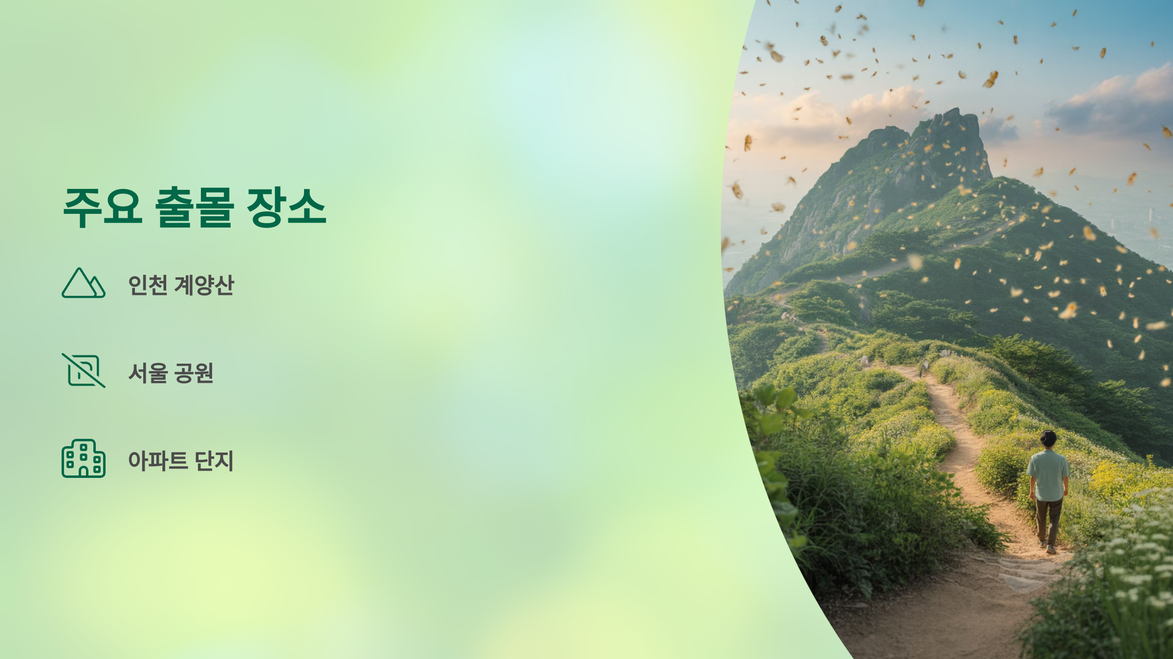 올해도 어김없이 러브버그는 6월부터 7월까지 활발하게 나타나고 있으며, 특히 인천 계양산, 서울 공원, 산책로, 아파트 단지 등에서 대량으로 목격되고 있습니다.